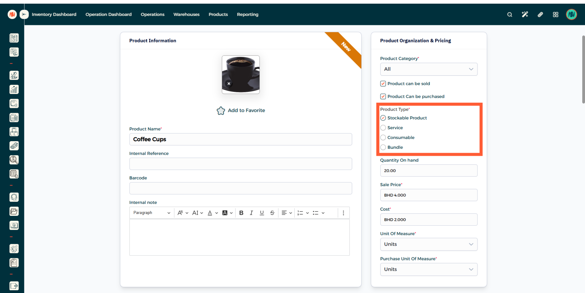 Make sure to select the product type as Stockable Product